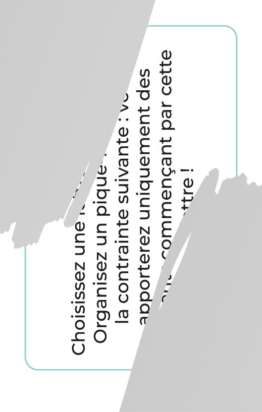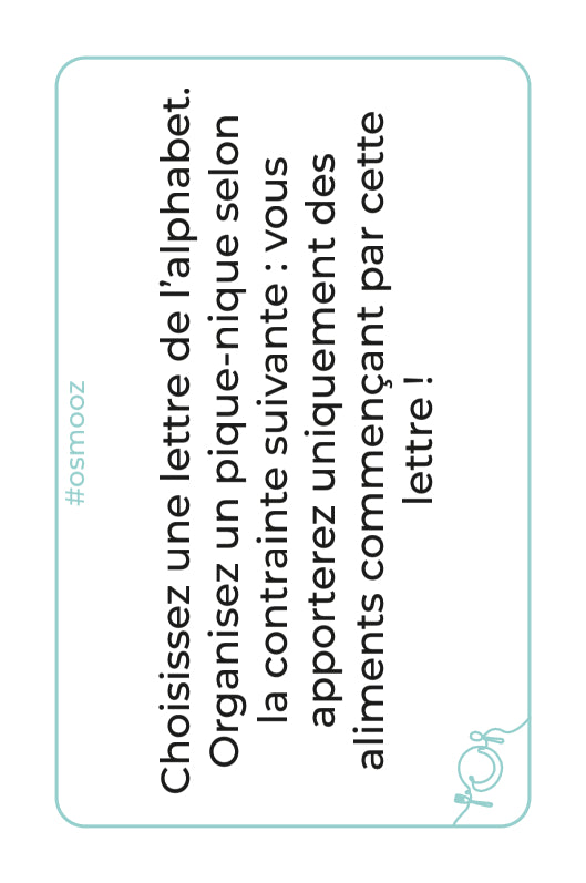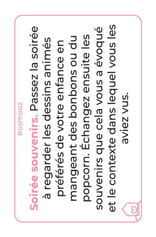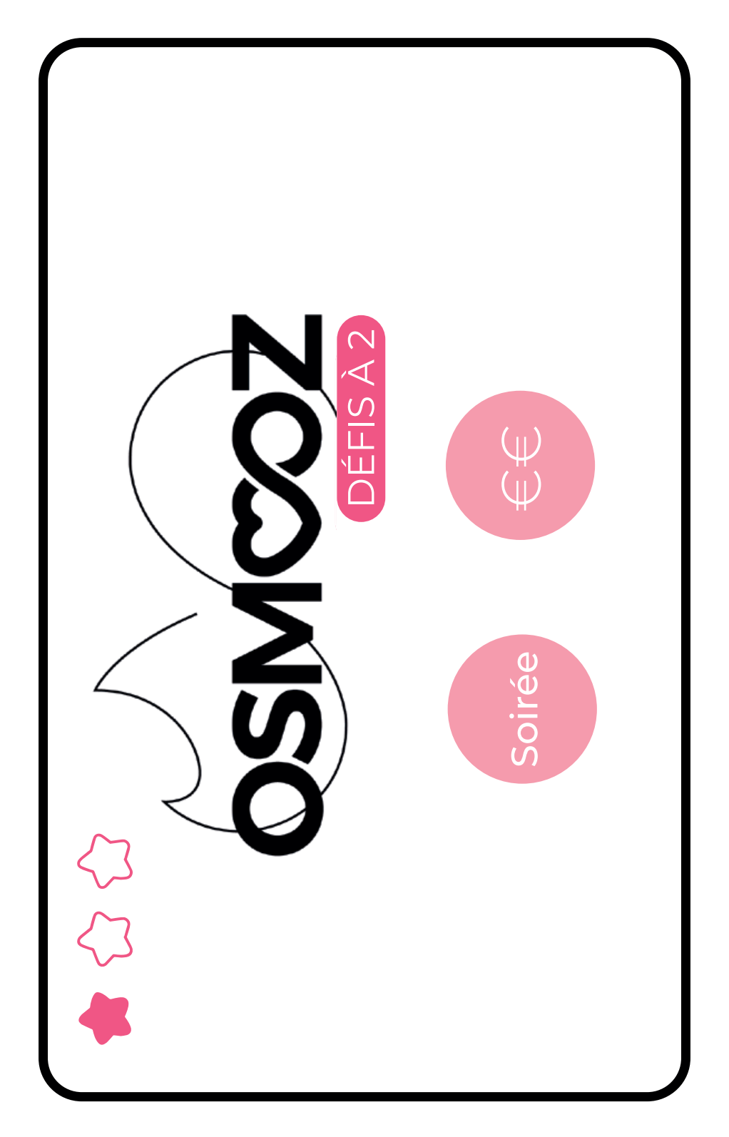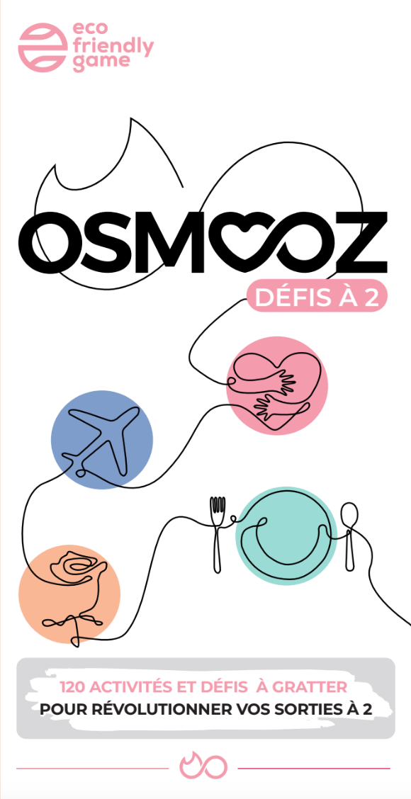 Osmooz contient 120 cartes défis réparties en 6 catégories : J't'emmène au vent, Home sweet home, Amour food, Caritatif, Double Date, Graine de sportifs